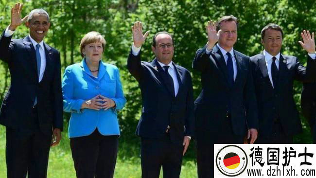 照片上从左到右依次是:美国总统奥巴马、德国总理默克尔、法国总统奥朗德、时任英国首相卡梅伦和意大利总理伦齐。