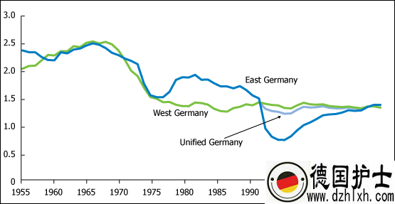 1955-2010东西德出生率对比,东德(蓝色曲线)在90年代中期生育率曾大幅降低