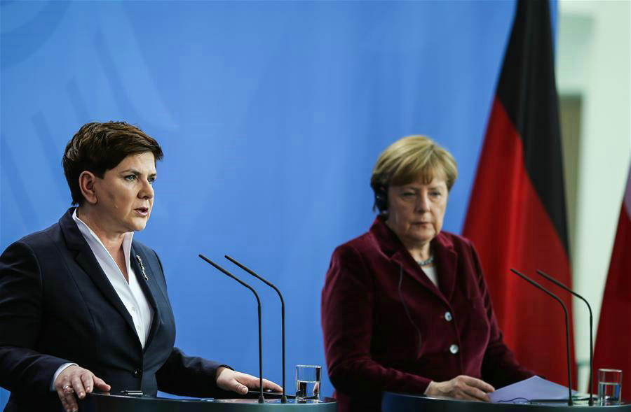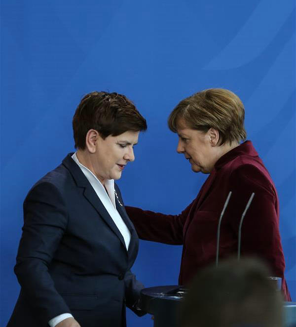 2月12日,在德国柏林,德国总理默克尔(右)与波兰总理贝娅塔·希德沃出席新闻发布会。新华社记者张帆摄