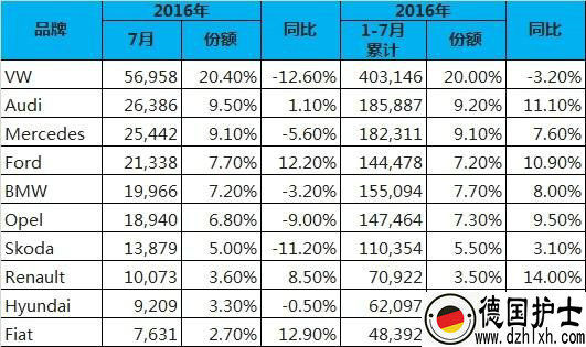 以下是7月德国销量前十品牌情况: