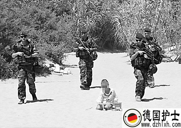 法国圣特罗佩海滩上巡逻的军警与玩耍的小女孩