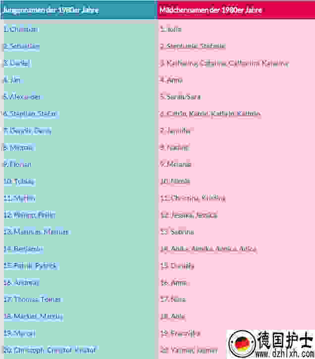 德语发音 德国80后的最热德语名 编辑:德语入门学习 2018/09/02 来源:www.dzhlxh.com 次浏览 德国80后的最热德语名(左边为男生名,右边为女生名):德语 难,天津德语,德语天津,在线翻译德语,德语的国家,德语国家,