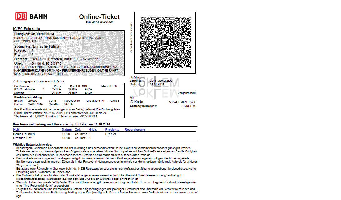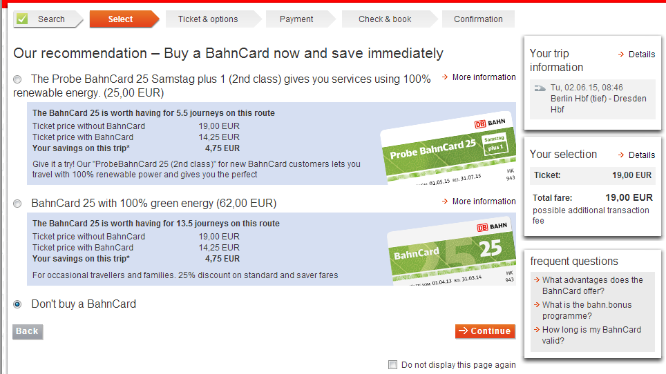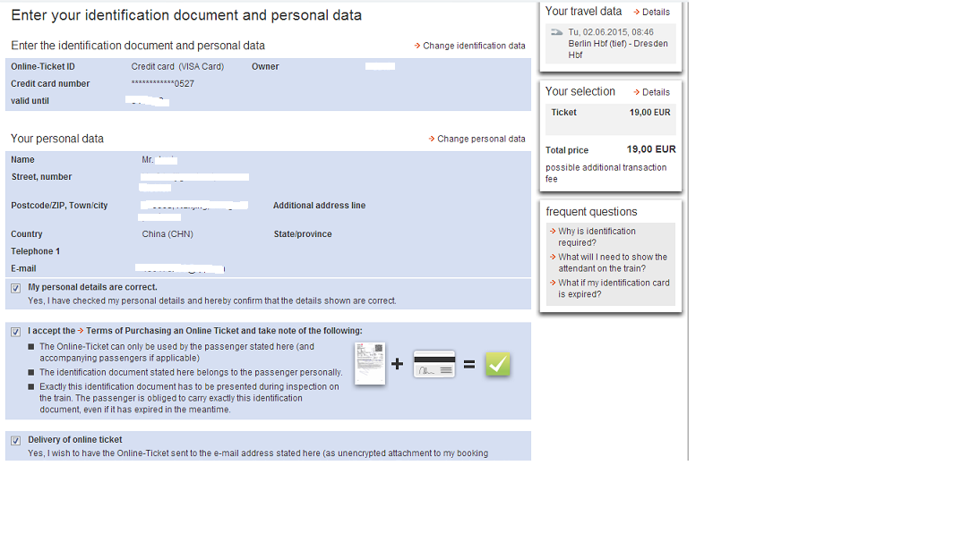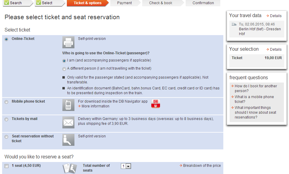 德国铁路 德铁官网 http://www.bahn.de/p_en/view/index.shtml 以订2015年6月2日8点左右 柏林到德累斯顿EC/IC快车车票为例 1.左侧栏输入站名,记得一个城市主火车站都是城市名+hbf(敲入首字母会有选项的) 如果想要快速列车 记得勾上Prefer fast connections,而慢车RE R等列车一般不需要在德铁官网购买,可直接 使用各州州票;但如果只是想查询慢车具体情况,我会在下面游记中关于拜仁州票使用方法上会详细阐述 选择passengers乘客选项中,下拉菜单如果你没有德铁打折卡(短期旅游不建议购买,不划算),默认no reduction 2.点击Search后,网页列出了8点左右快车一系列车票,选哪趟?当然最便宜最快的19€车,单人19€双人29€,优惠10€。点开红色箭头,我们能看到详细站台过路站(本车直达)以及一些限制,这车的限制就是自行车运输需要预定,名额有限。但EC系列的车一般都是长途客车而非动车,像这趟EC173人非常多,因为是从汉堡开往威尼斯,中间要穿过柏林德累斯顿布拉格维也纳等大大小小热门城市,人非常多,像这种车最好花钱定位置,否则就站岗吧。 4.点击continue ,选择don't buy a BahnCard 5 点击continue后 ,选择online-ticket,只要是自己的账户同时自己也乘坐列车,其他人跟着你一起,只要您的身份信息就行,也就是说只需选择第一项,这里注意Moible phone ticket这项在这个页面可以不选,等付款后,如果您手机里有DB Navigator APP,会自动含有手机二维码电子票,检票时可以直接拿手机给列车员扫二维码而无需打印纸张(当然纸质票最好打印一份以防万一) 如果您想订座,在最下面Would you line to reseve a seat选择(一般IC/ICE系列车无需订座,而像法兰克福-慕尼黑,柏林到慕尼黑等热门线路最好订座,其余车一般都是运椅子模式) 6 这一页基本无视,直接下一步 7.到了这就该信息确认了,信用卡信息等核对好,且下面三个钩都钩上,确认信息正确,确认火车票+信用卡验证模式,确认车票pdf文件将发送的邮箱地址 付完款之后,大概10分钟左右就会将pdf票发到您邮箱内 票样 提示:360手机助手可下载安卓版DB Navigator登陆后在ticket那栏中可以看到购买的车票信息,列车员检票时把check这栏和你买这票所使用的信用卡同时展示即可 |