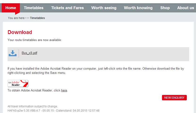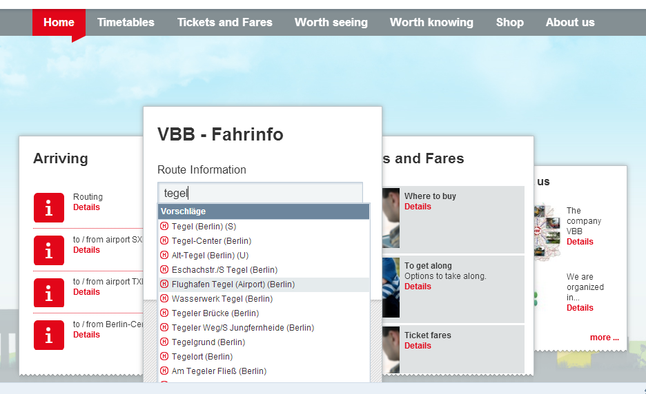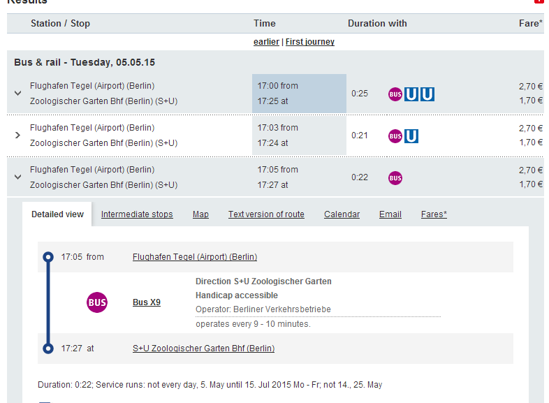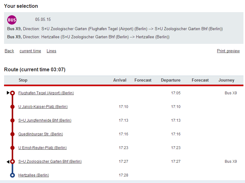 柏林公交 VBB查询 http://www.vbb.de/en/index.html 使用方法: 1.点对点公交查询,以tegel机场到柏林动物园为例,假设此时为柏林当地时间17点 输入tegel进行模糊搜索,会有下拉菜单,按照google地图的站名,我们找到Flughafen Tegel;动物园为Zoologischer Garten Bhf (Berlin) (S+U)(我们查询德国城市公交地铁时,多注意S+U也就是s-bahn和u-bahn的站名,这些往往是枢纽站,公交线路较多),之后点击start 搜索结果是按照时间先后排列的,尽量选直达车,后面的价格如果您买了柏林天票就无视,1.7€是单次3站内价格,2.7€是单次三站以外价格。这里直达车就是第三个BusX9,展开详细,点击BusX9 点击BusX9后 可看到详细的线路停站时间以及线路运行地图 这个网站还有个好东西,就是公交线路信息离线pdf,获取方法:仍以BusX9为例,点击上图中的lines,等待片刻(中间会跳转两个网页无需理会),直到出现以下网页,而后直接下载pdf,建议装载于ipad中以便在没网的时候查阅Bus_x9.pdf183.79KB 此外,推荐手机里装一个VBB的app,安卓系统在google play上搜索VBB, IOS直接去苹果商店搞 |
