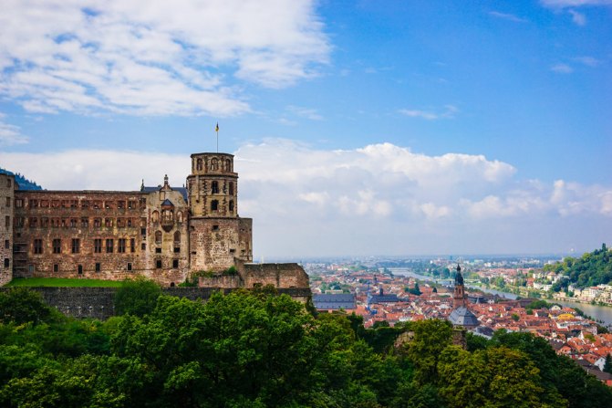 在青色的王座山(Königstuhl)上,红色沙石所建的海德堡城堡,虽已残毁,却仍不失王者风范,俯视着山脚下的海德堡老城和内卡河。