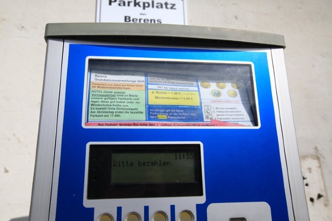 德国城市里的停车位普遍不多,讲究眼疾手快,而且绝大部分是需要付费的(休息日可能有些时段是免费的),这样的车位一般有两种。一种是没有栏杆,进去后在这个区域有个自动售票机,估计停车的时间自觉付钱找零(有些还只收硬币),然后把打印出来的票据放在车内醒目的地方(一般是前车玻璃下面)。还有一种是有栏杆的,比如地下停车库,和国内一样,在进口处拿一张磁卡(纸),但回来取车时要注意了,德国人工贵,出口处是没人收费的。你必须先要找到自动收费机,把磁卡插进去,它会自动计算你停车的时间和费用,付完钱后磁卡退出,然后你到停车位取车出门,在出口处插入刚才的磁卡,要不然你就被困在里面了。